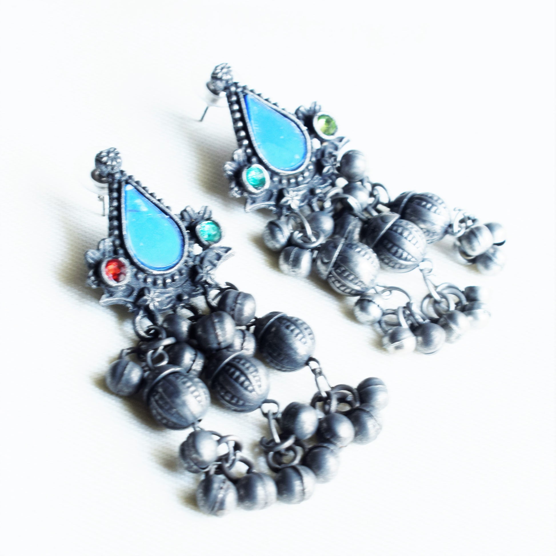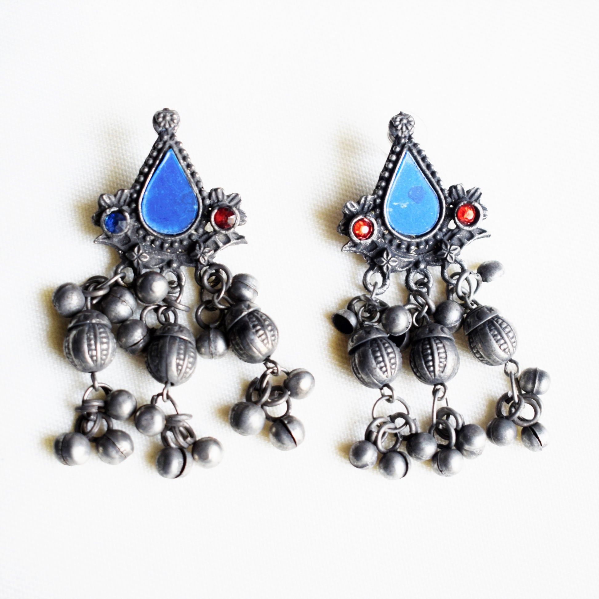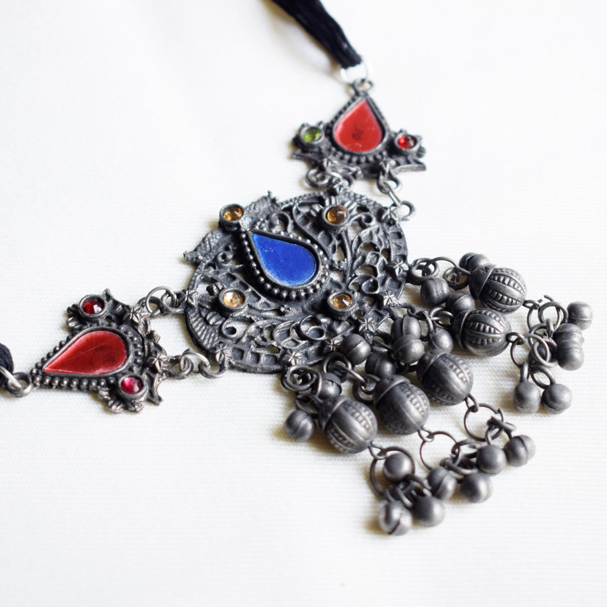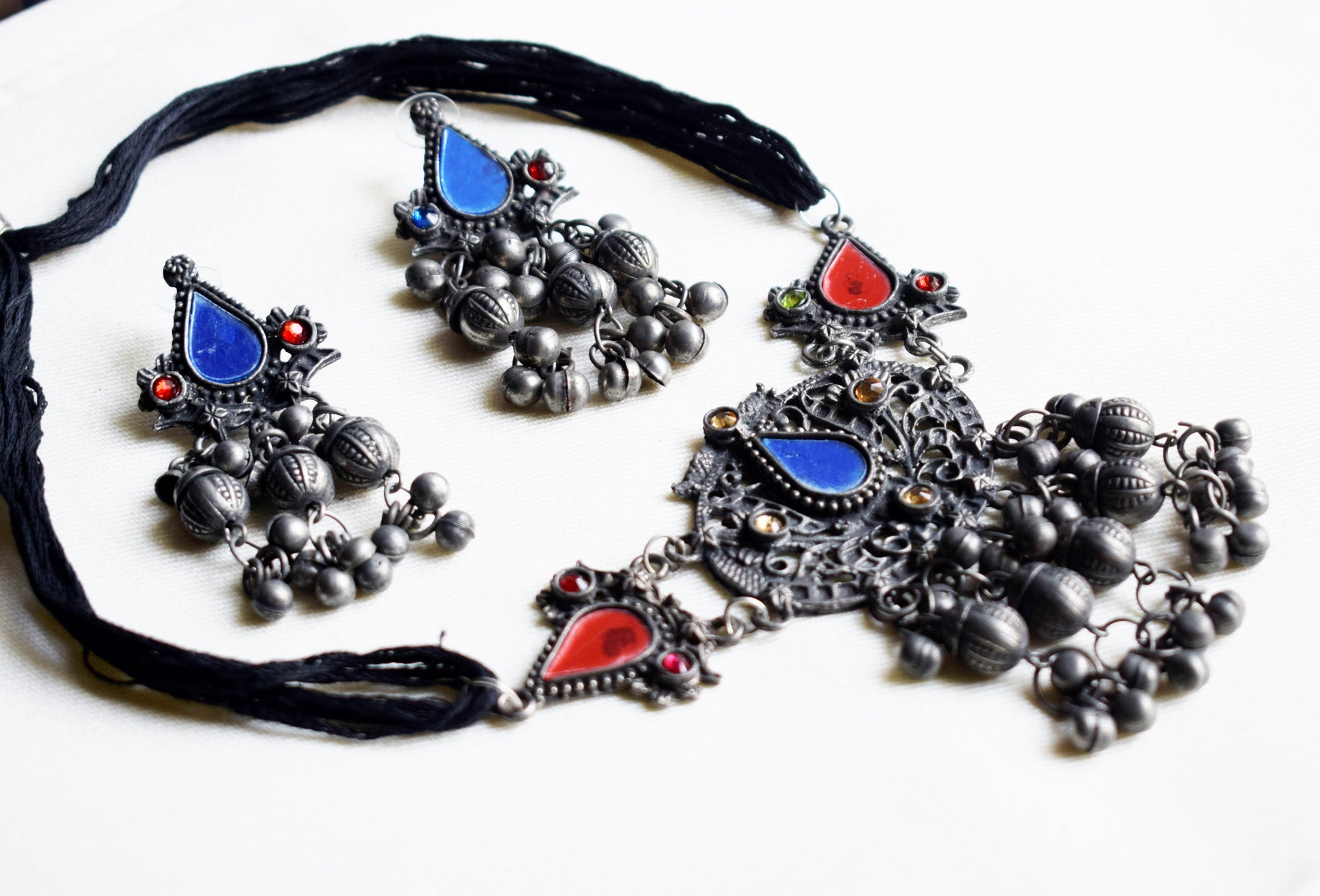 Antique Afghani Silver Oxidised Half Choker Necklace with Earrings
