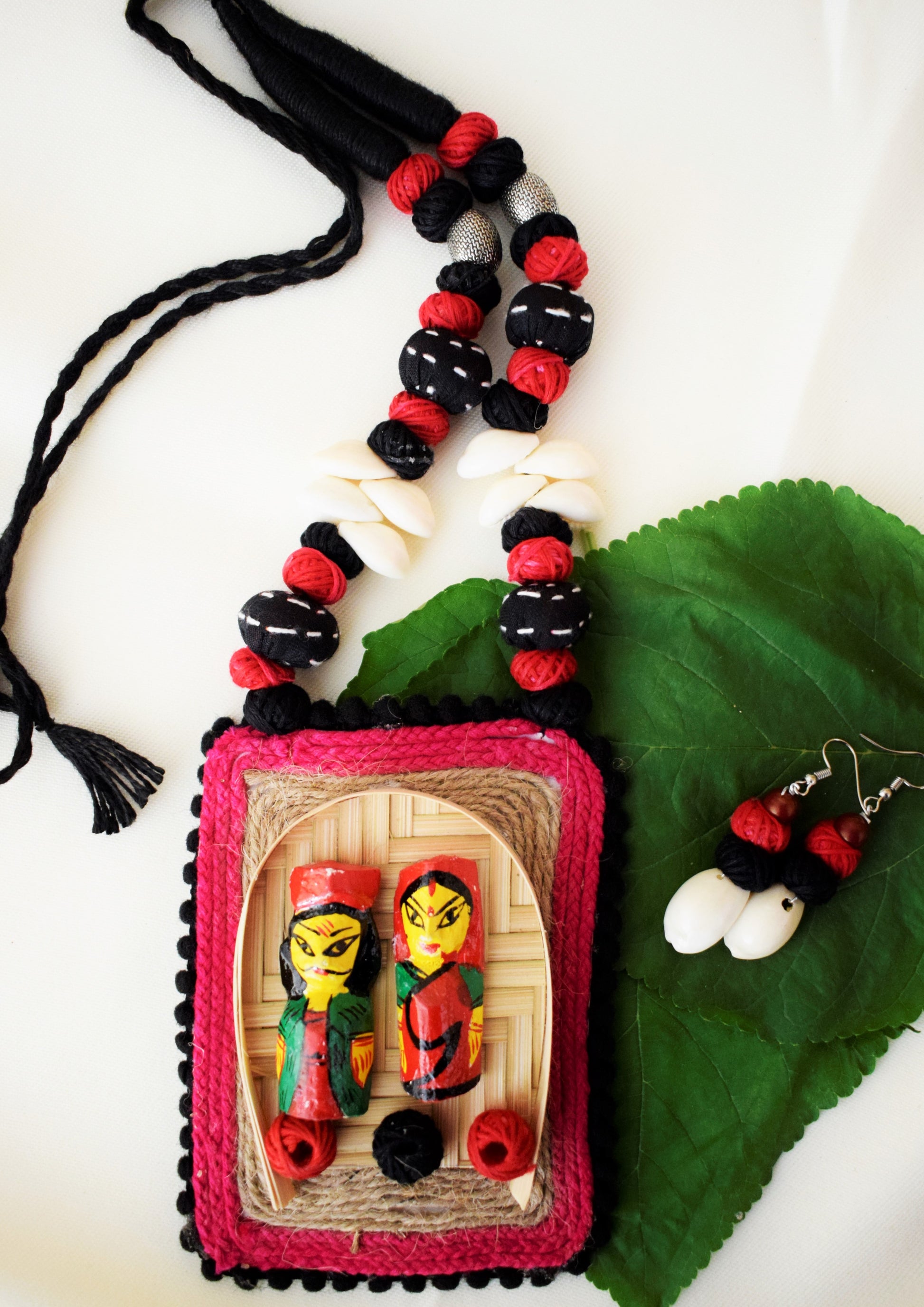 Bamboo Dolls Pendant Fabric Necklace with Shell Earrings
