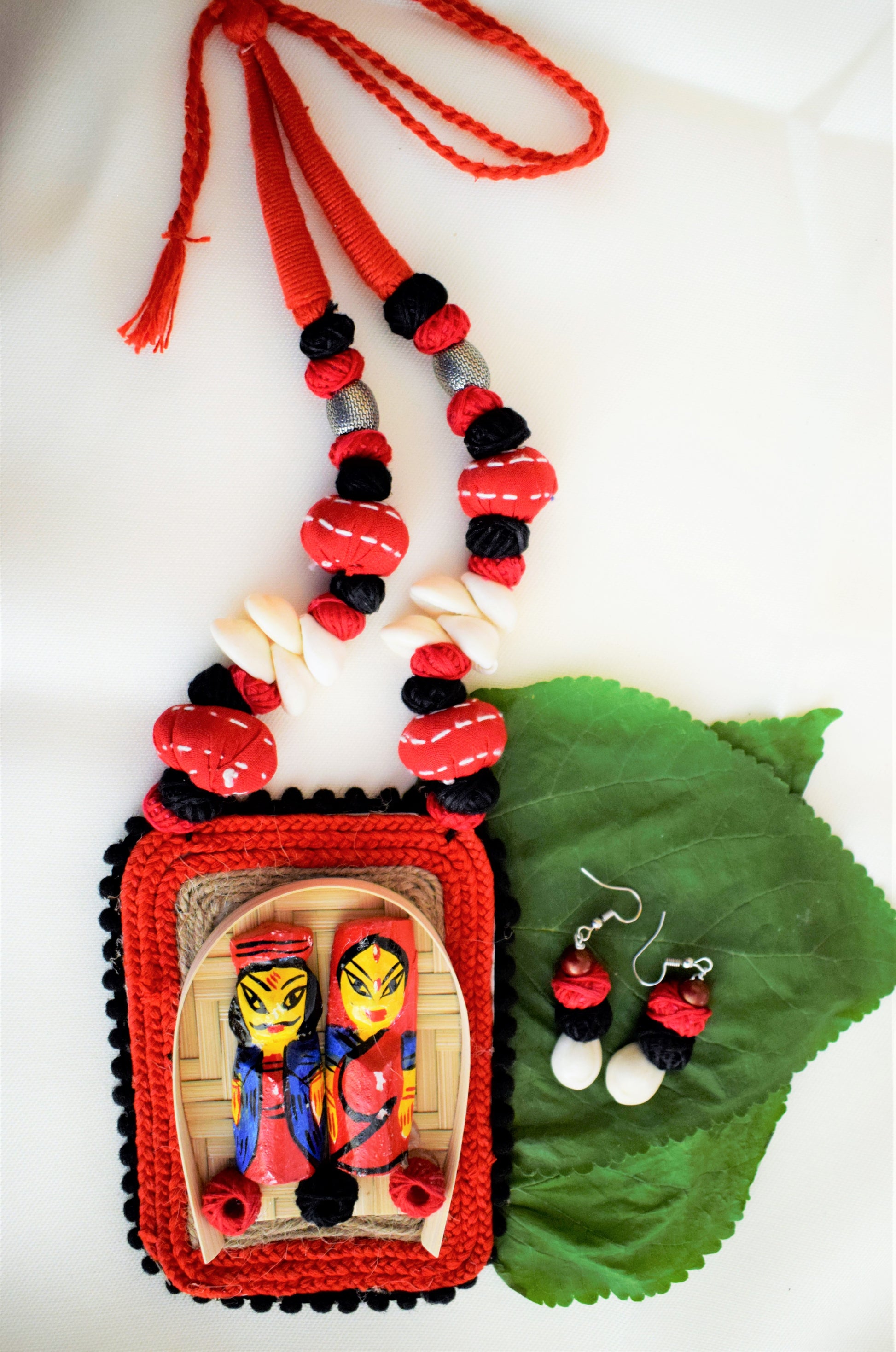 Multicolored Fabric Necklace Set with Bamboo Dolls Pendant and Sea Shell Earrings