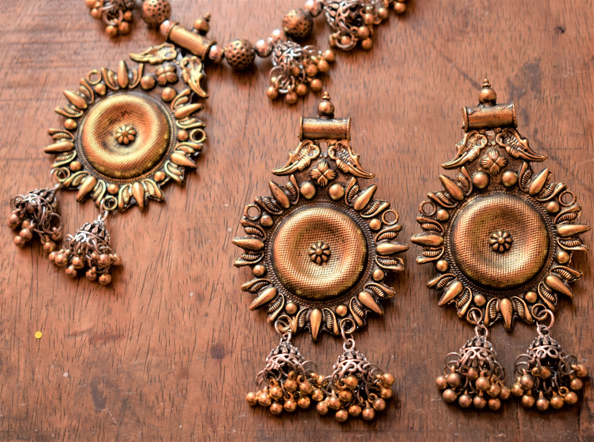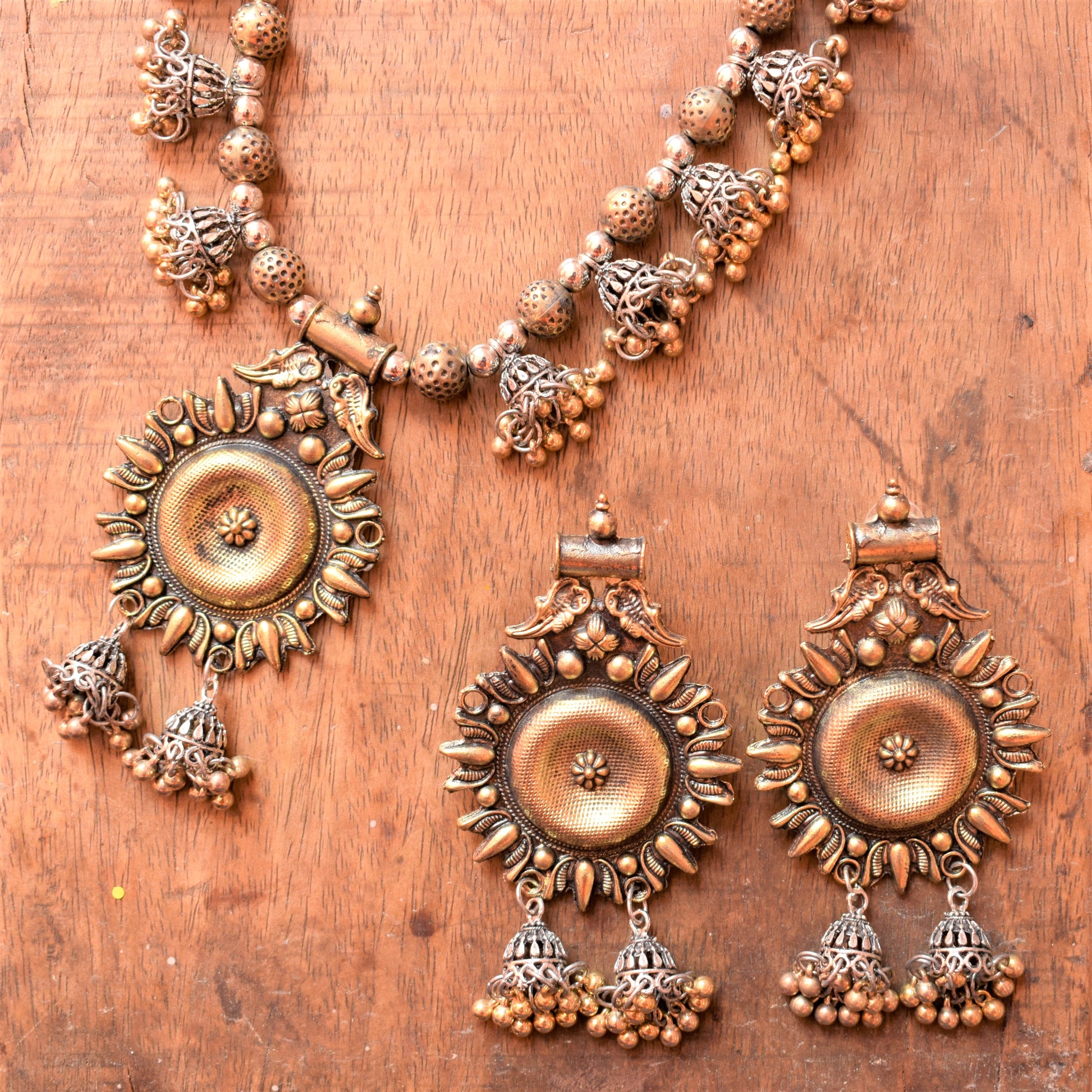 Designer Traditional Chakra Jhumka Necklace with Large Stud Jhumki in Dual Tone inspired by Matar Mala Style