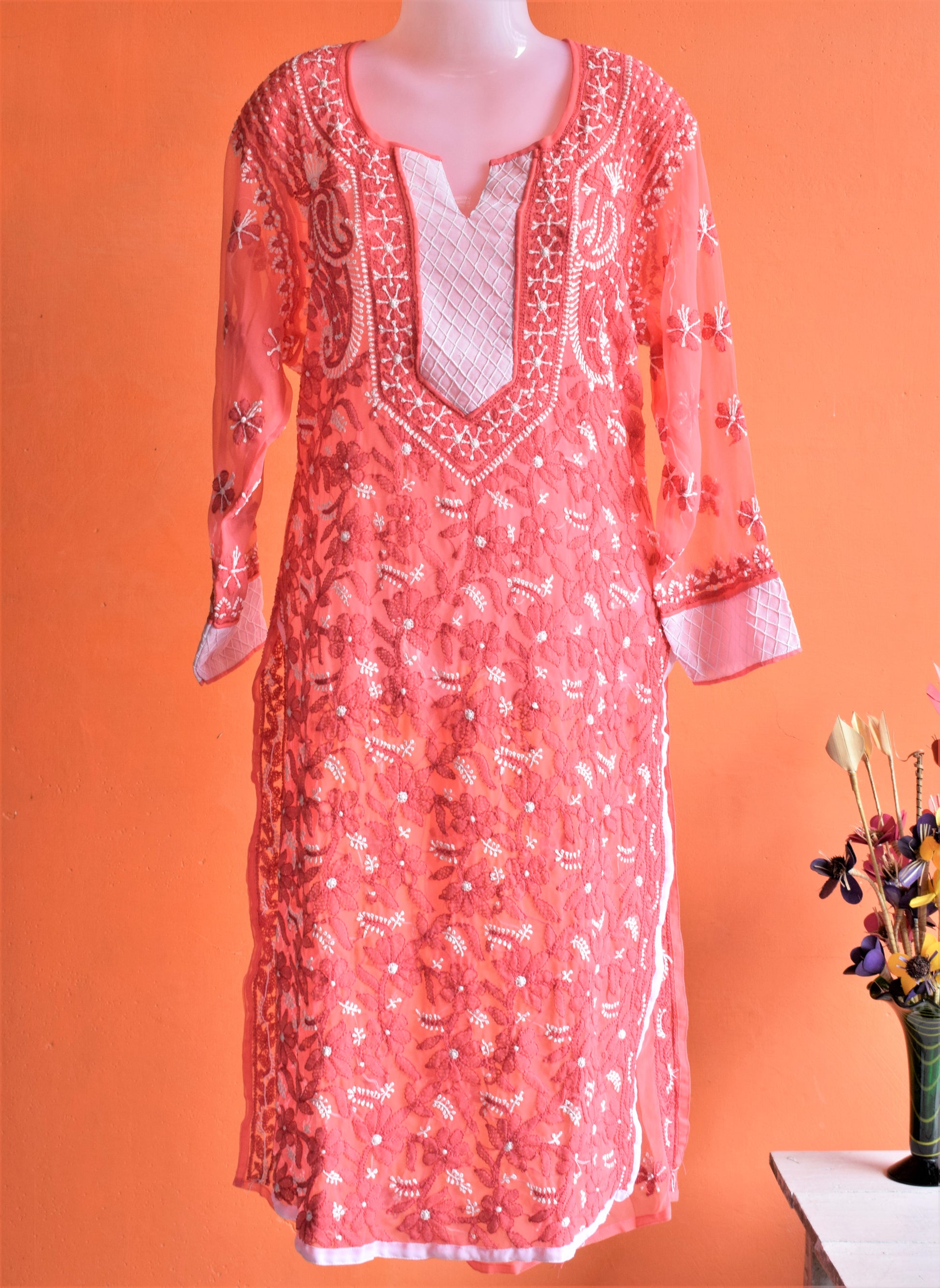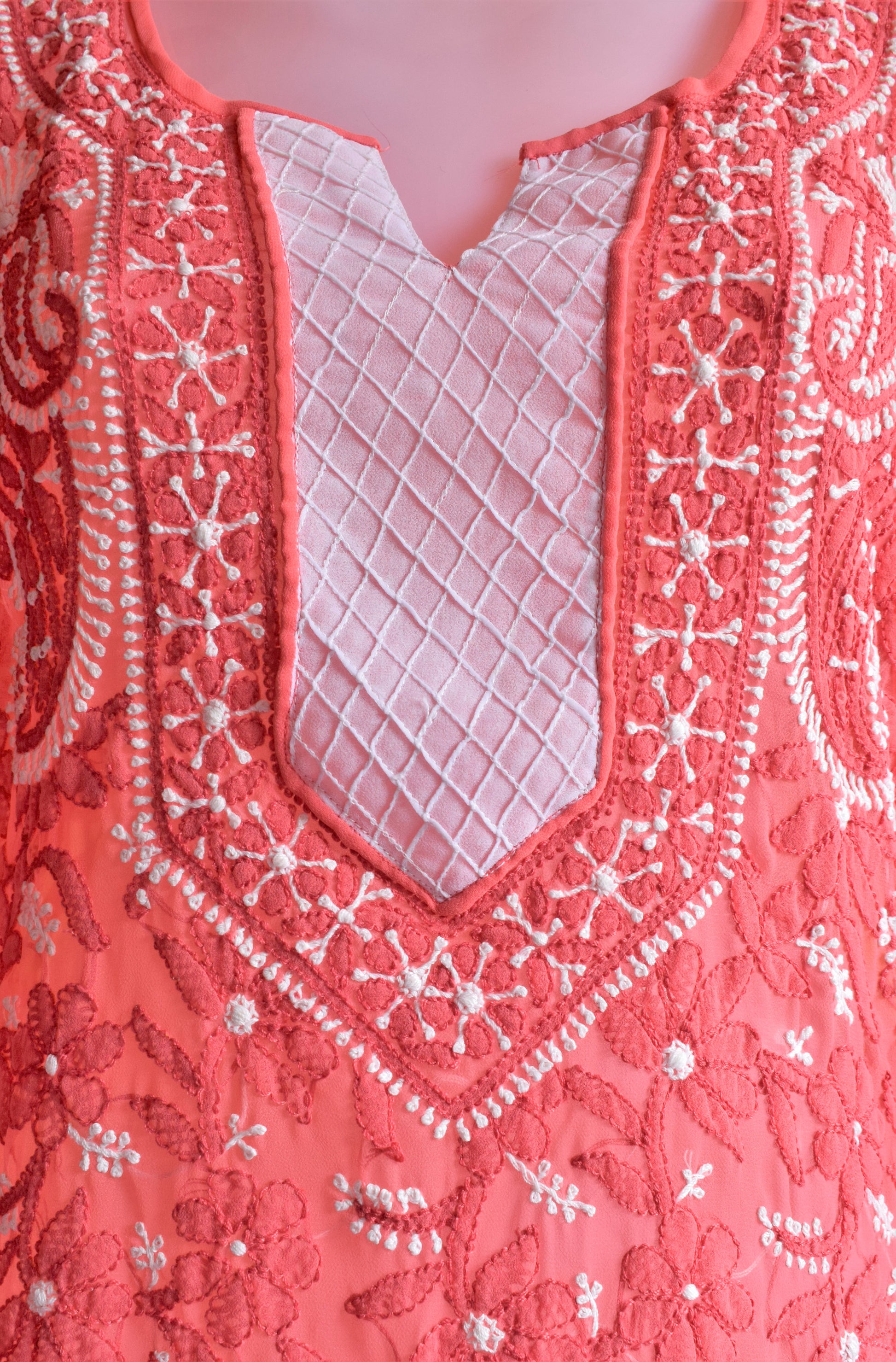 Chiffon Kurti with Chikan Embroidery in Coral Pink and White Soothing Summer Shades
