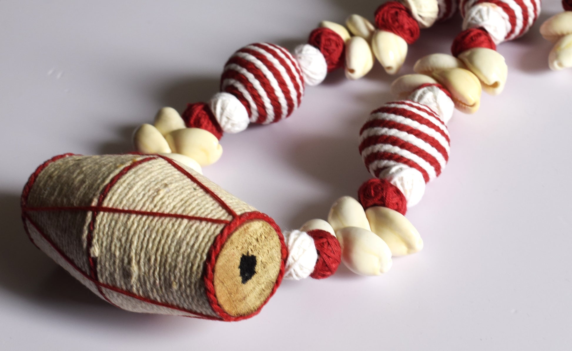 This handmade Dhak Sea Shell Fabric Necklace Set is perfect for Durga Puja celebrations. Beautifully crafted with an iconic Dhak Pendant, and adorned with the finest sea shell embellishments, this necklace is sure to make a statement.