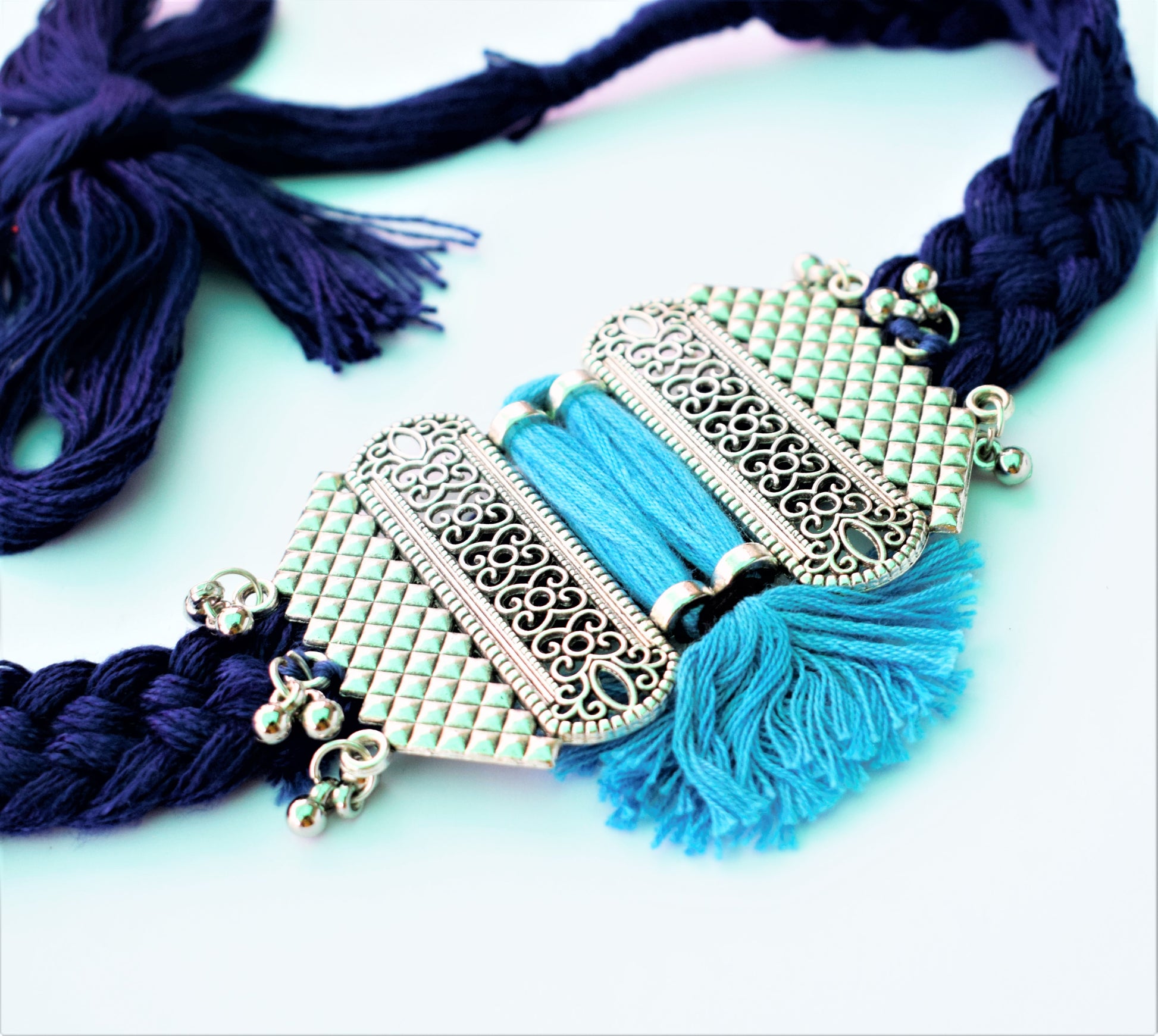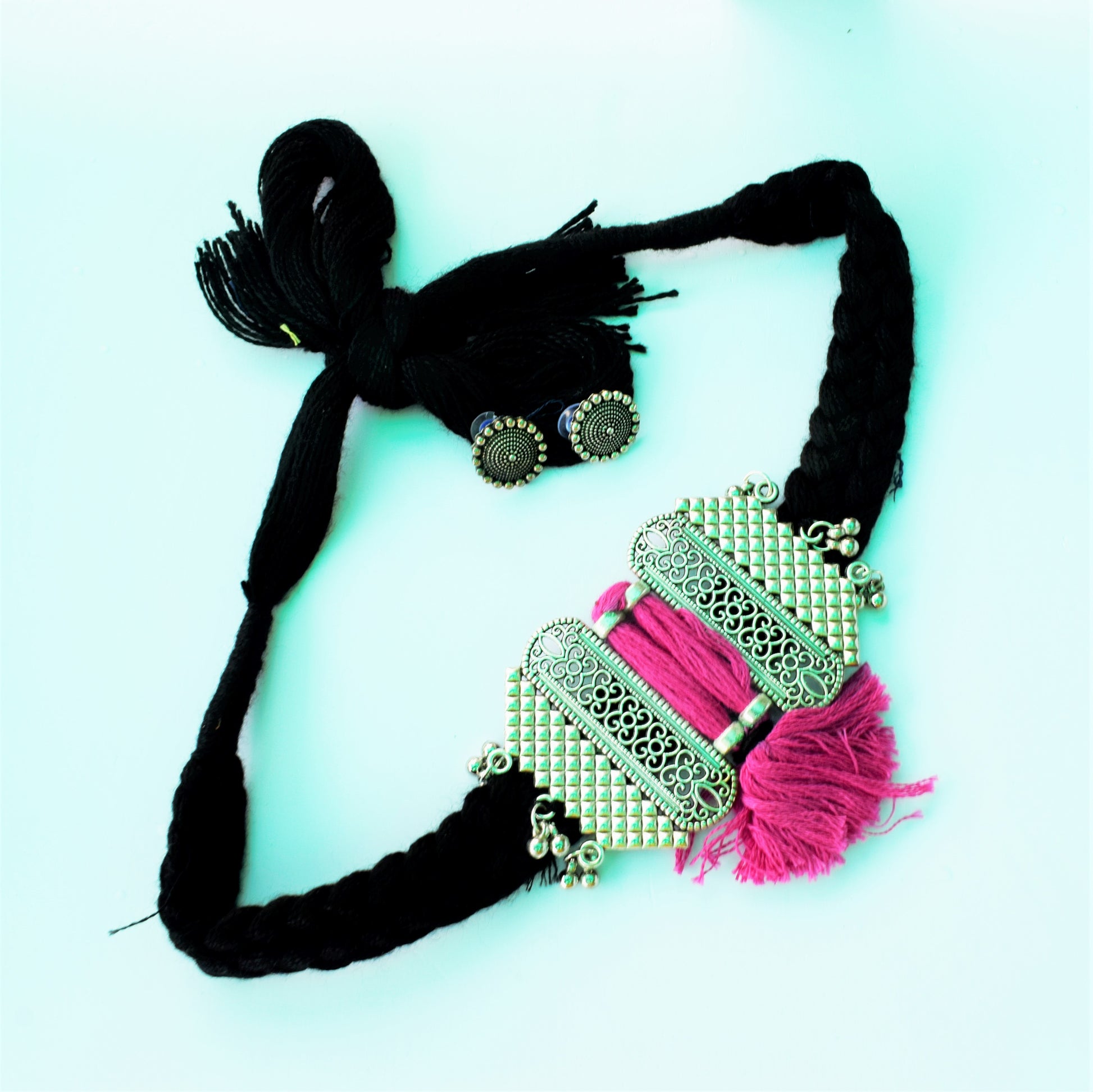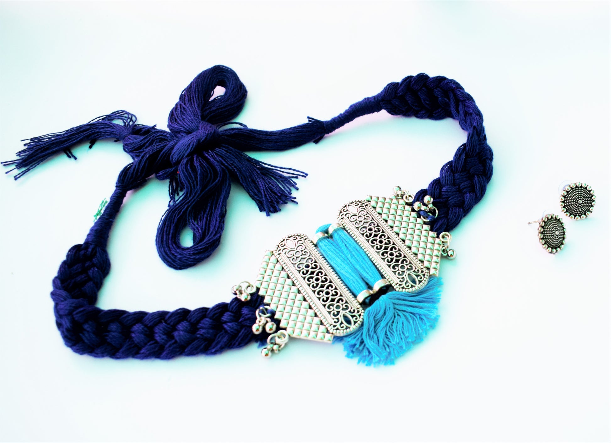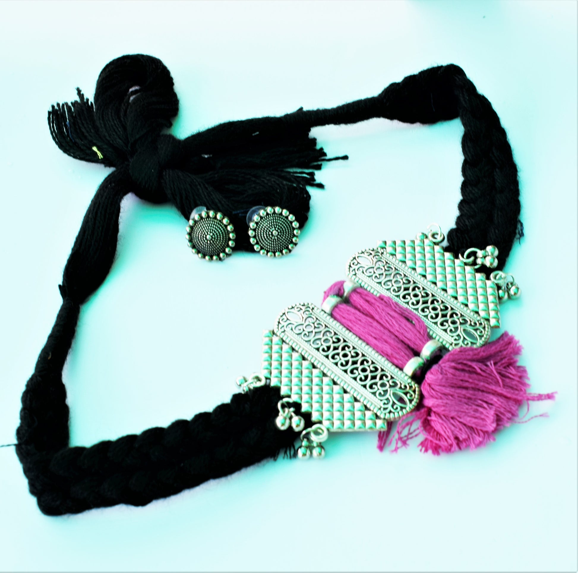 Fabric Necklace Set with Jharokha Pendant and Tribal Stud Earrings
