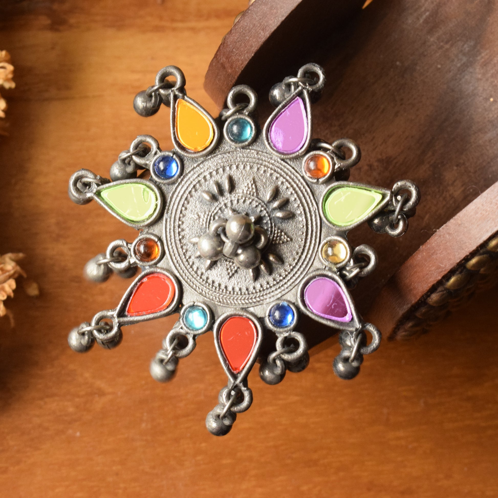 Exude elegance and culture with our Jumbo Afghani Glass Statement Ring. Inspired by Afghani style, this handcrafted ring features colorful glasses embellishments and Ghungroo beads. With an adjustable size, it guarantees a perfect fit and a bold statement. Complete your look with this unique and eye-catching piece.