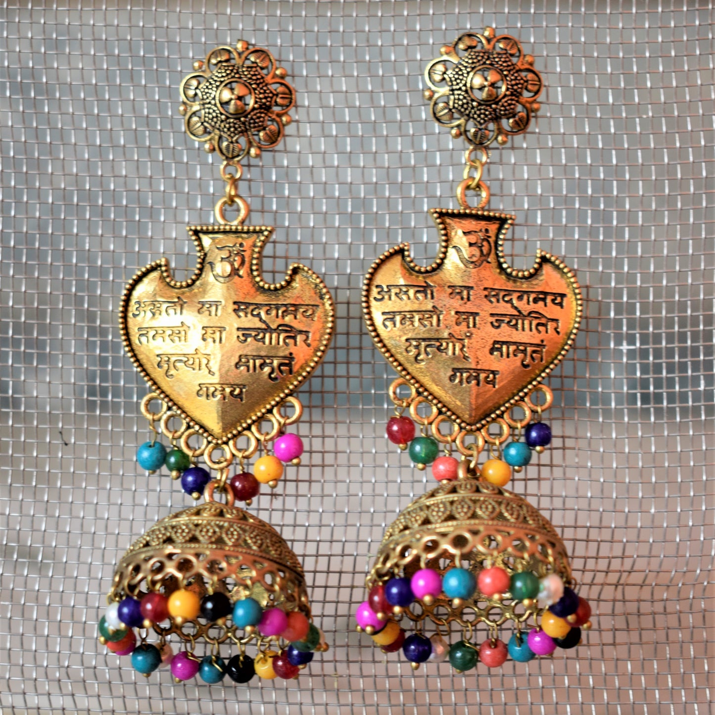 'असतो मा सद्गमय' Mantra Handcrafted in Spade Shaped Earrings with Colorful Bead Jhumka