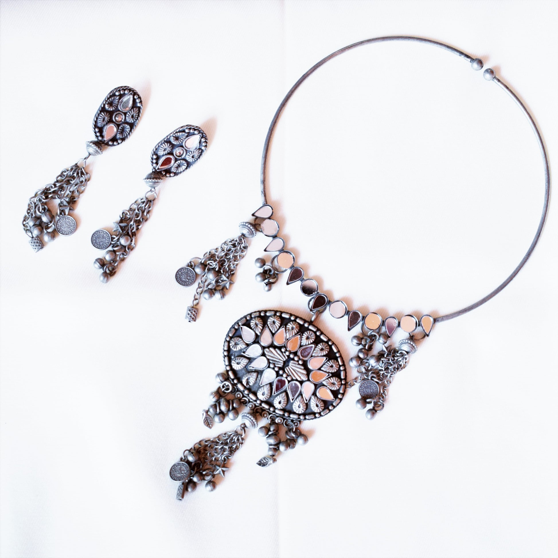 Mirror Embellished Charm Hasli Choker Necklace with Earrings