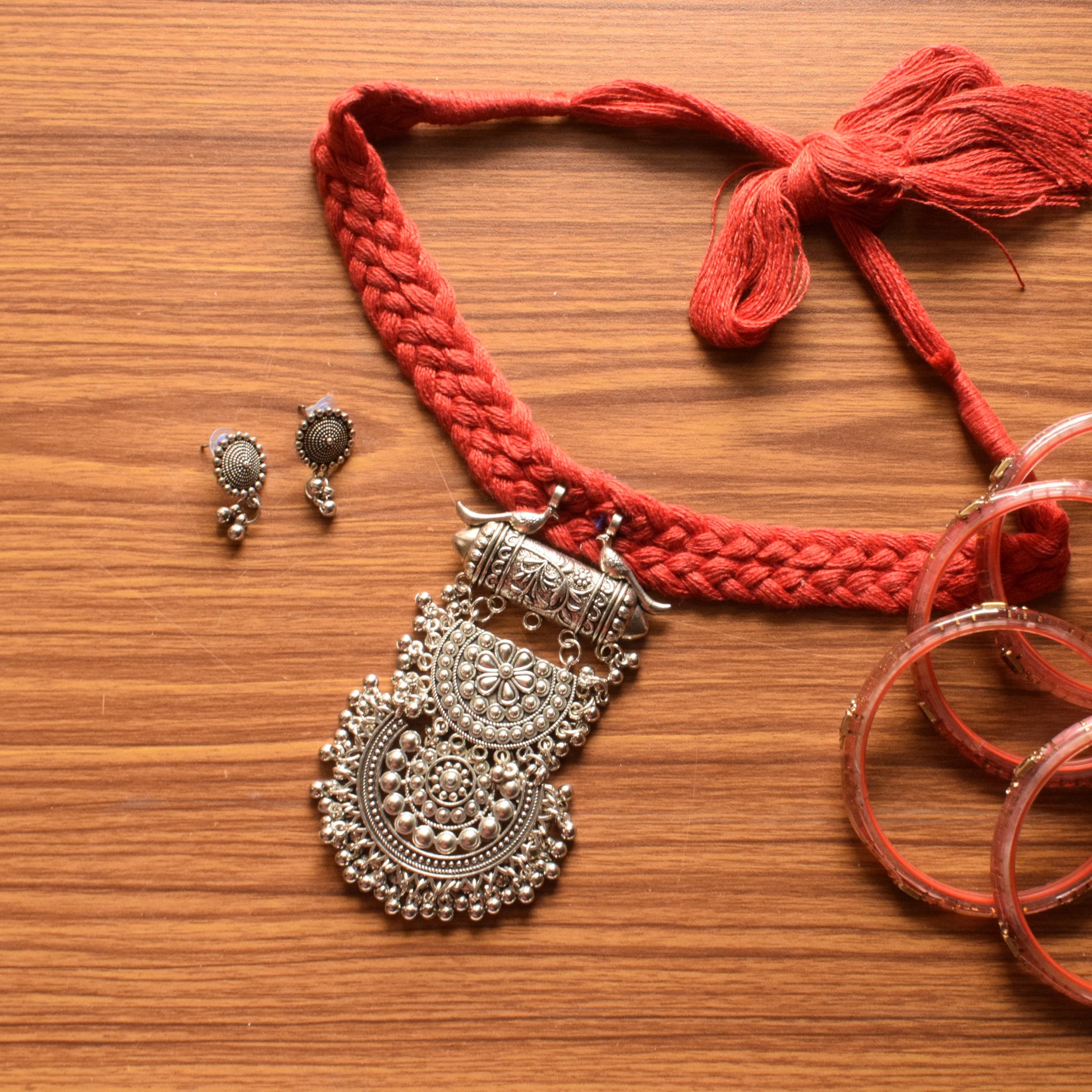 Experience the elegance and grace of our Paramsundari Silver Oxidised Layered Pendant Red Fabric Necklace. Adorned with a peacock chandbali pendant and embellished with ghungroo, this necklace also features a handwoven thread design and comes with a small stud earring. Elevate any outfit with this stunning and unique piece.