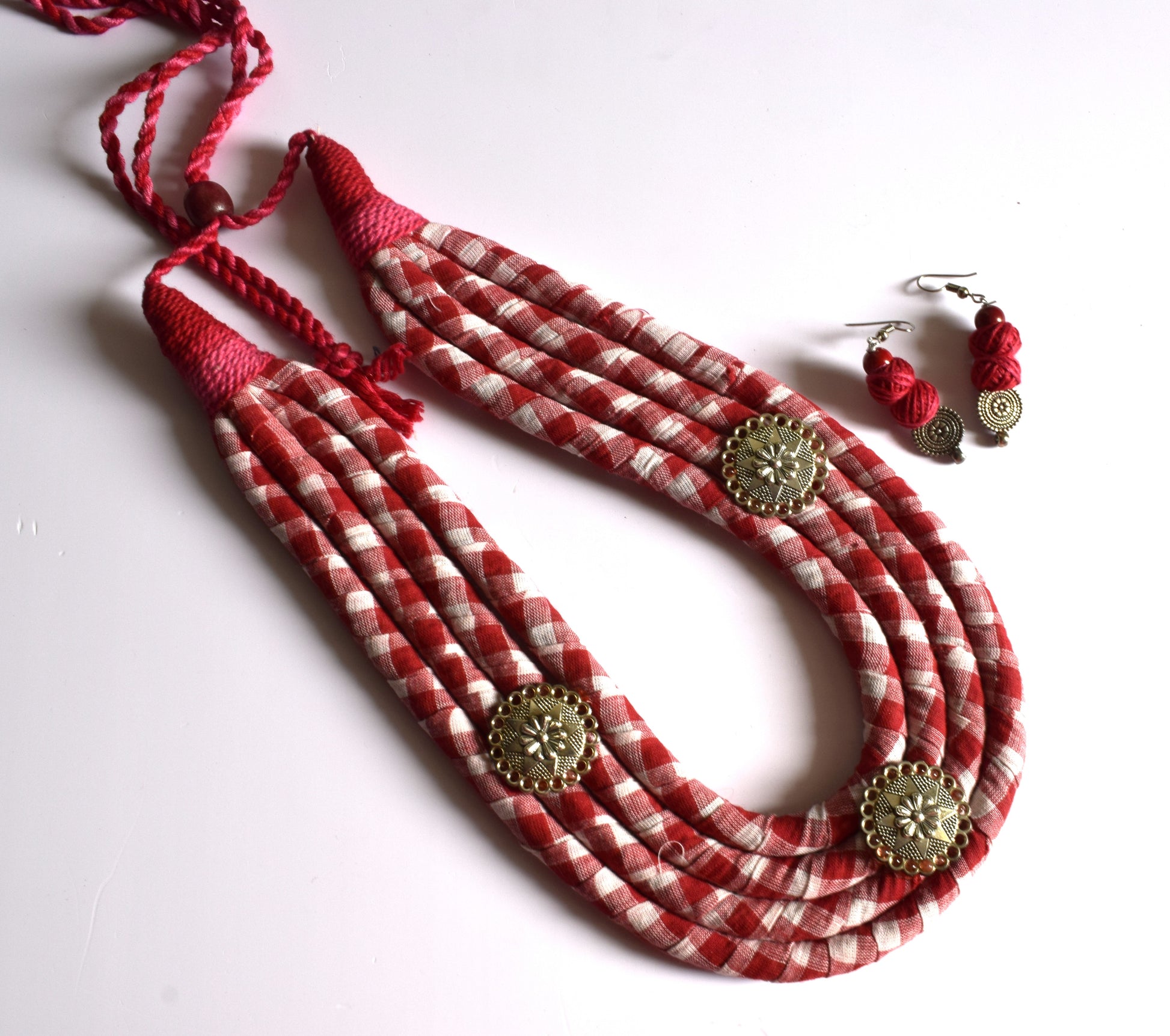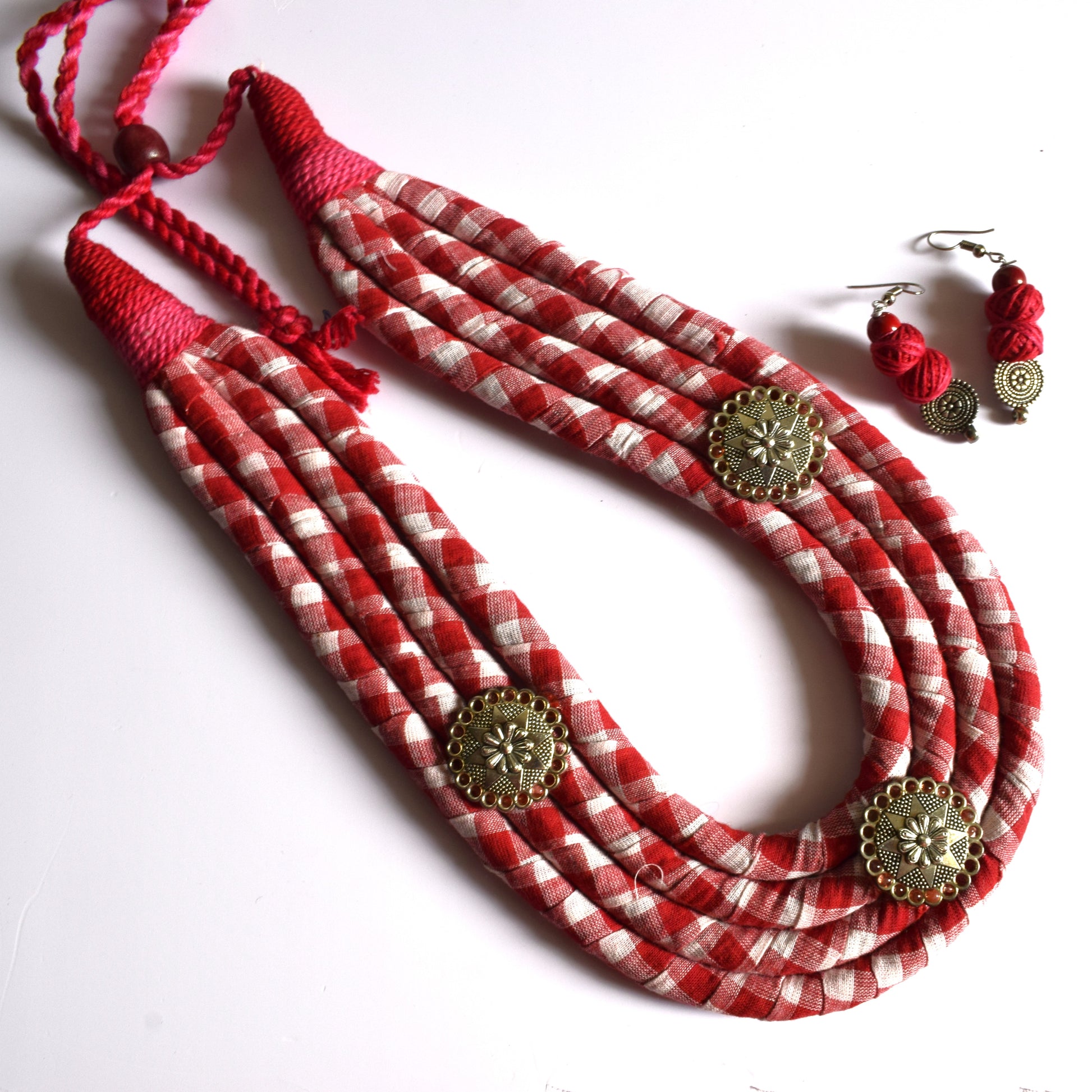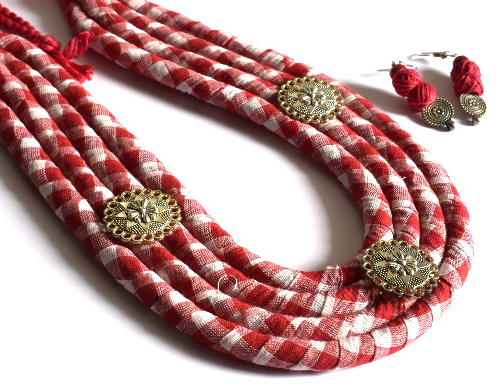 Red and White Checkered Fabric Necklace with Oxidised Metal Motifs and Dangler Earrings