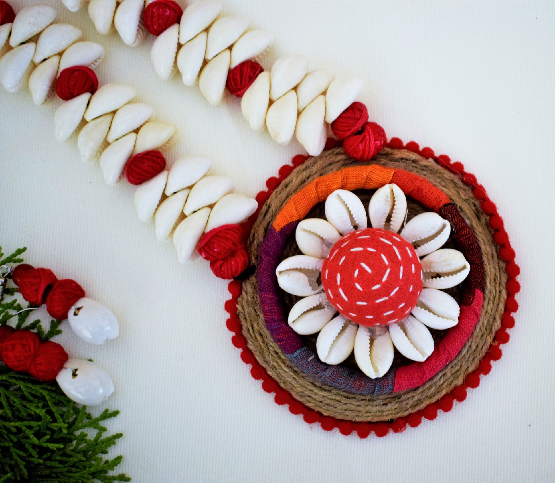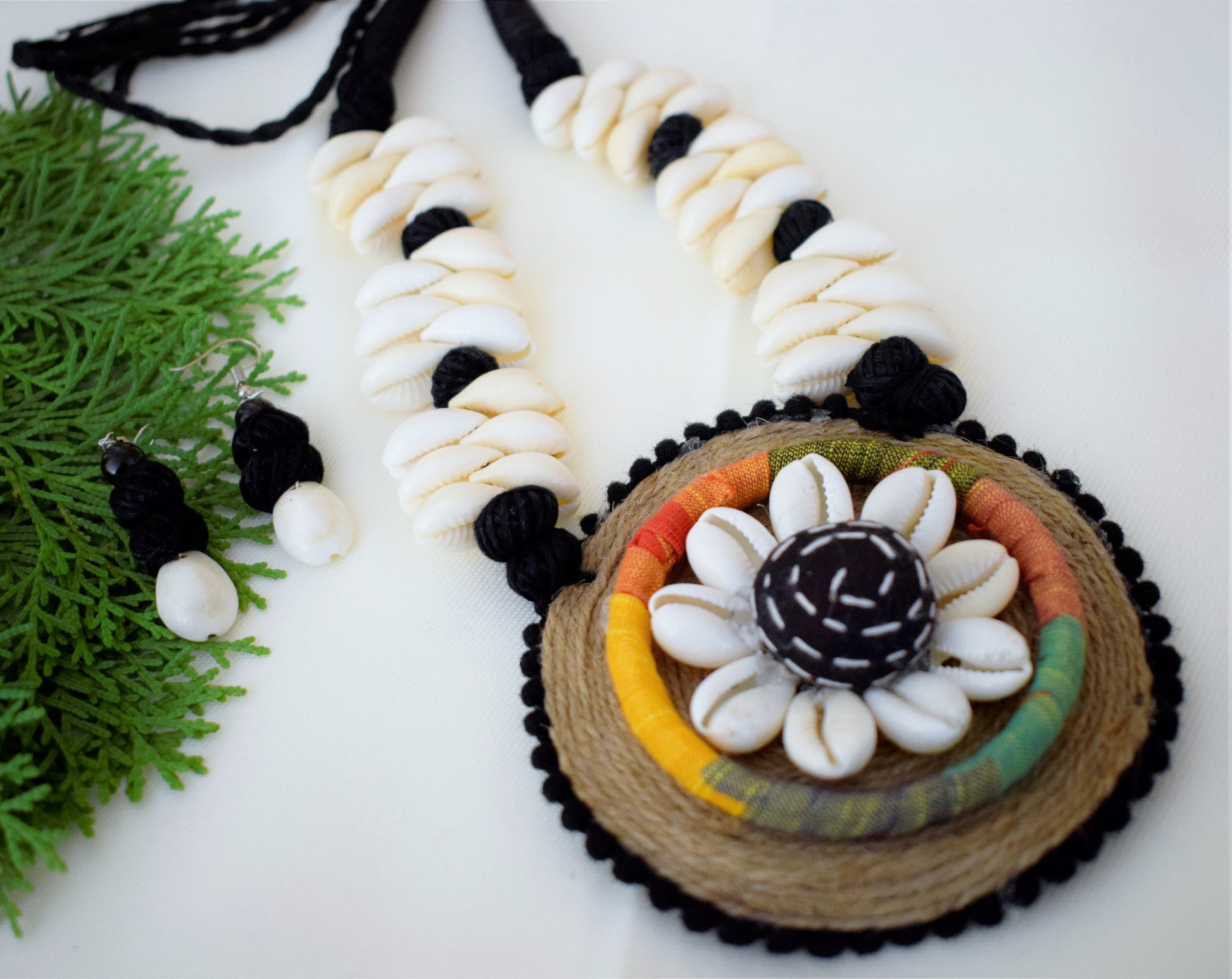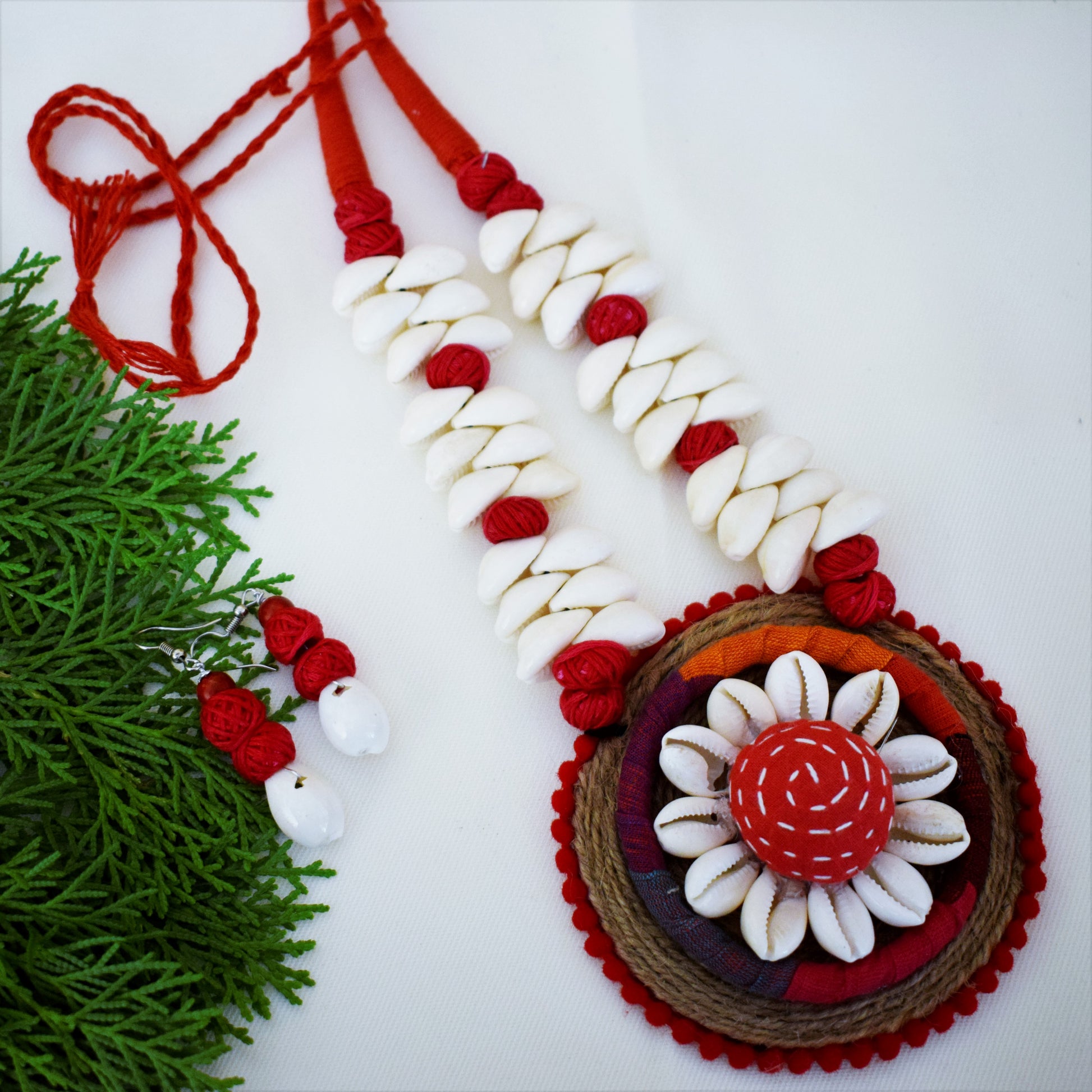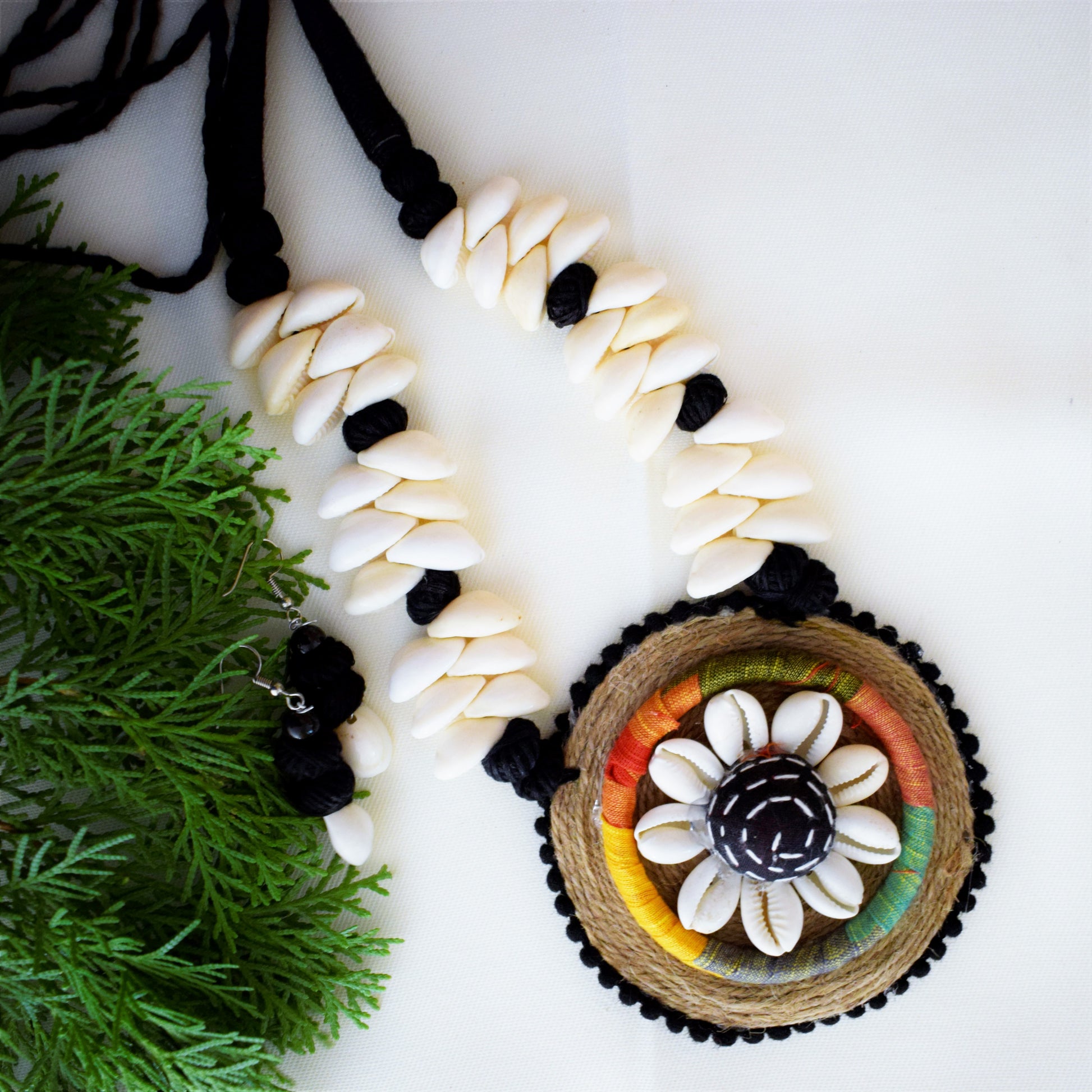 Multicolored Sea Shell Flower Pendant Fabric Necklace with Dangler Earrings