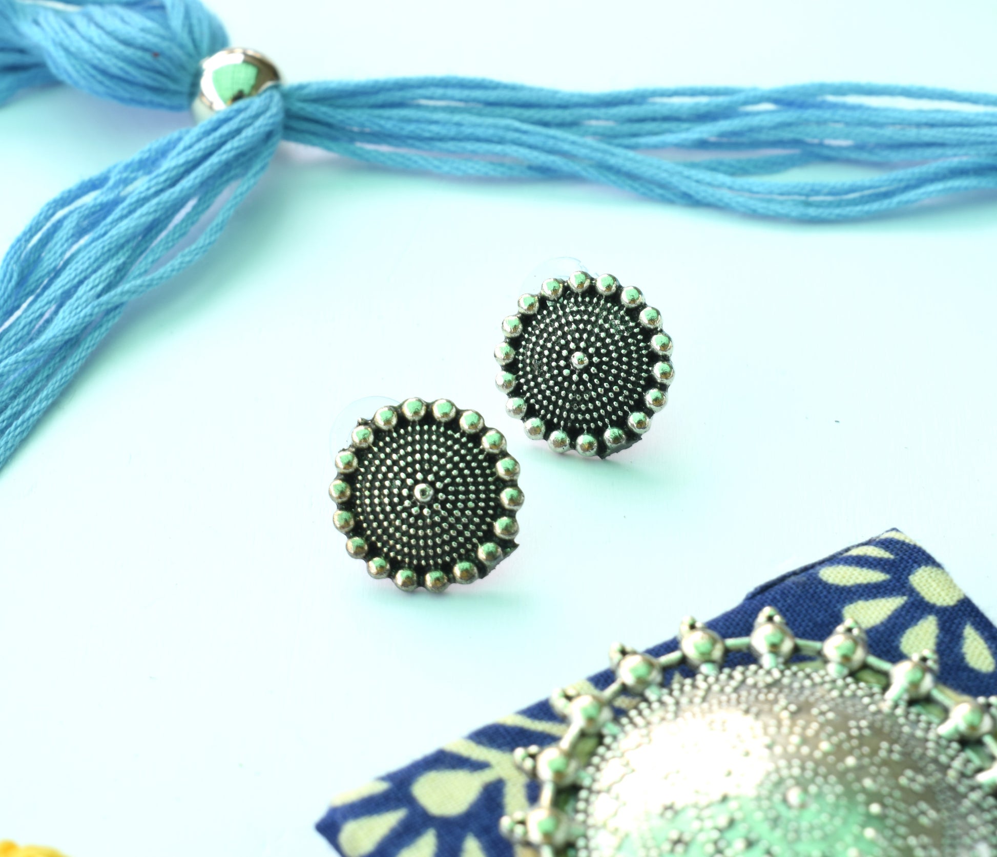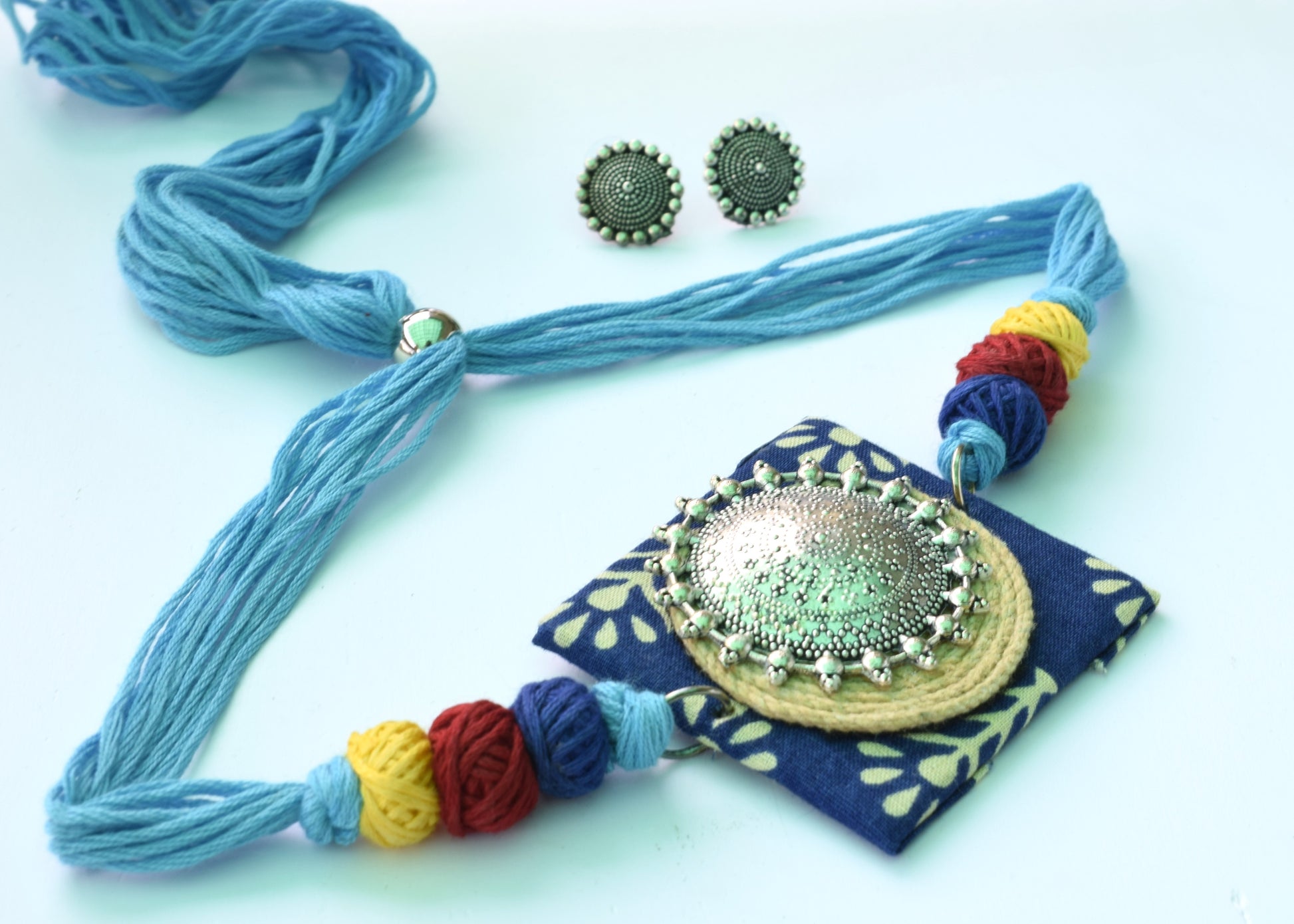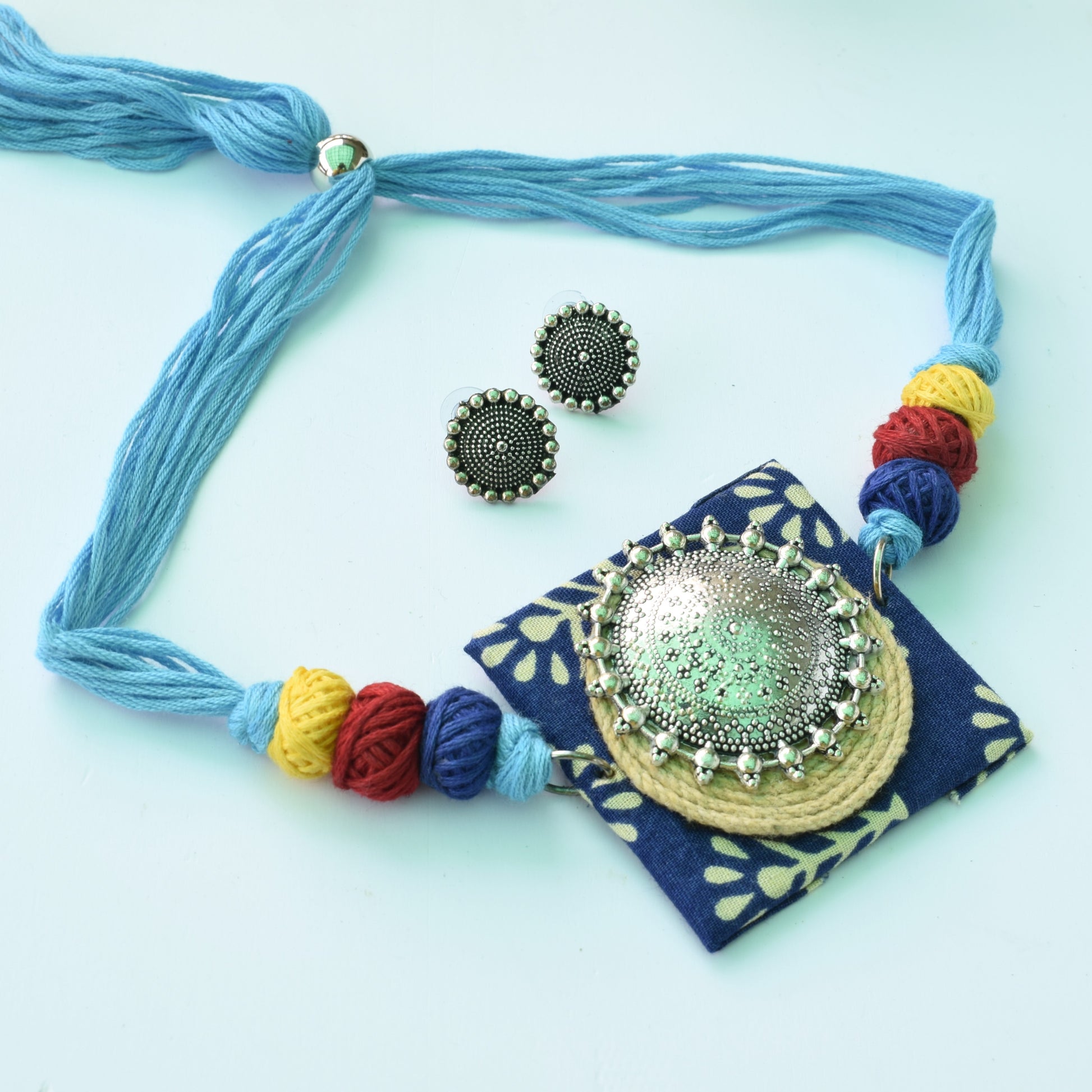 Geometric Fabric Necklace Set with Oxidised Chakra Pendant and Tribal Stud Earrings