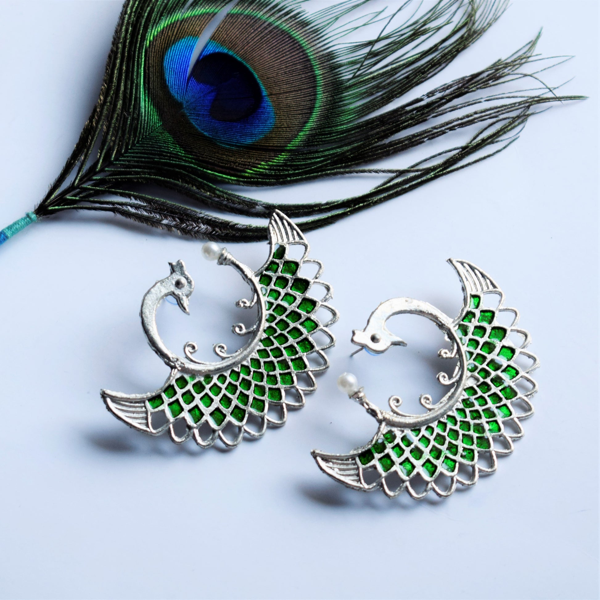 Large Silver Oxidised Peacock Earrings with Handcrafted Motifs & Meenakari Work