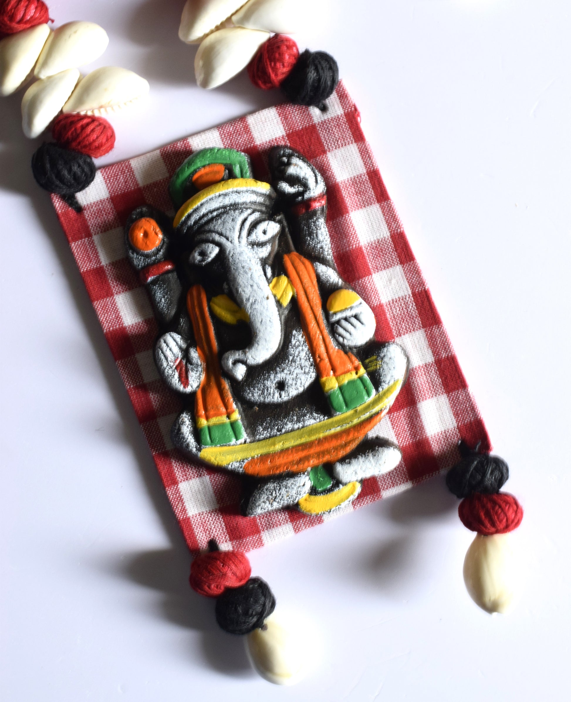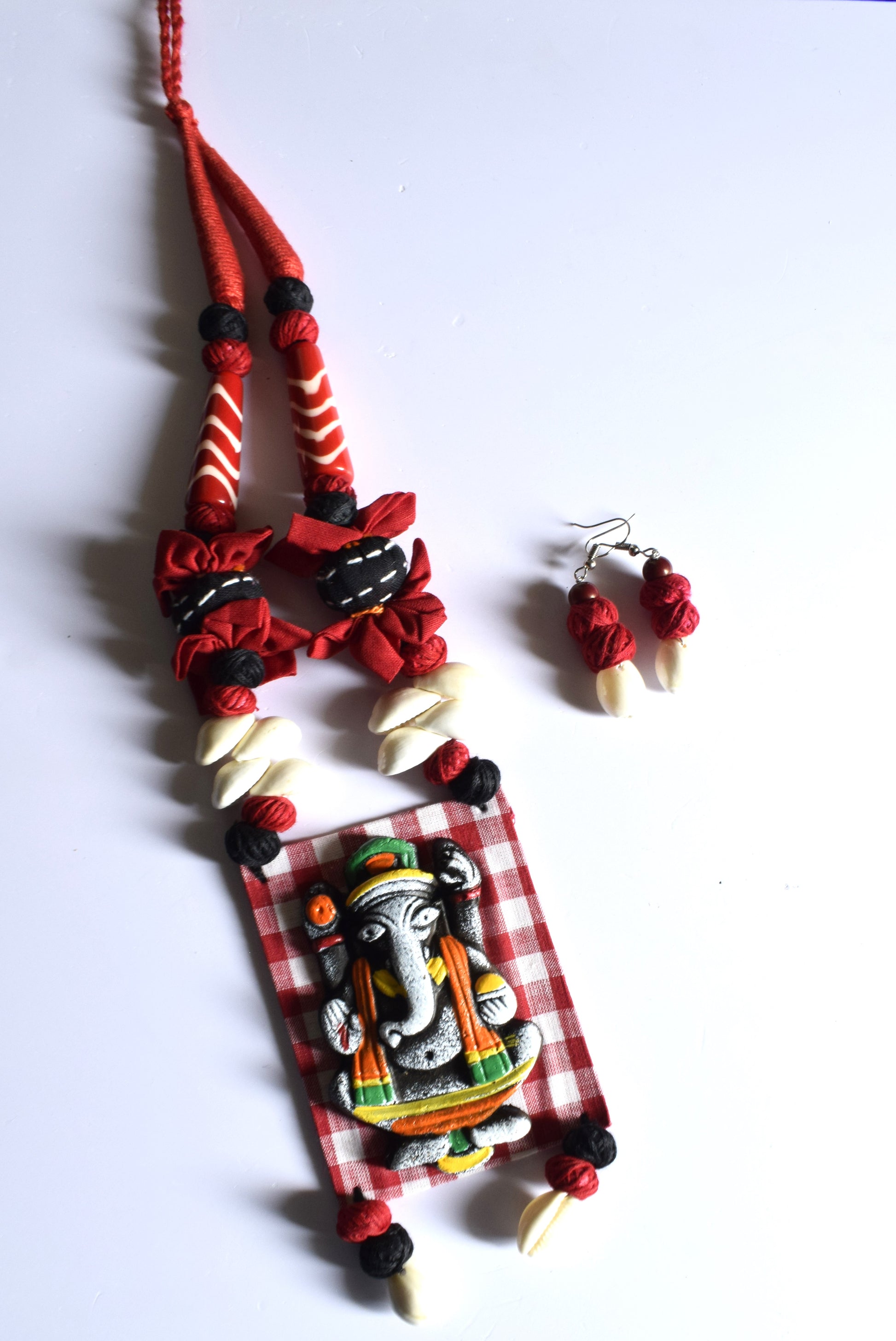 Terracotta Ganesh Pendant Fabric Necklace with Sea Shell Earrings