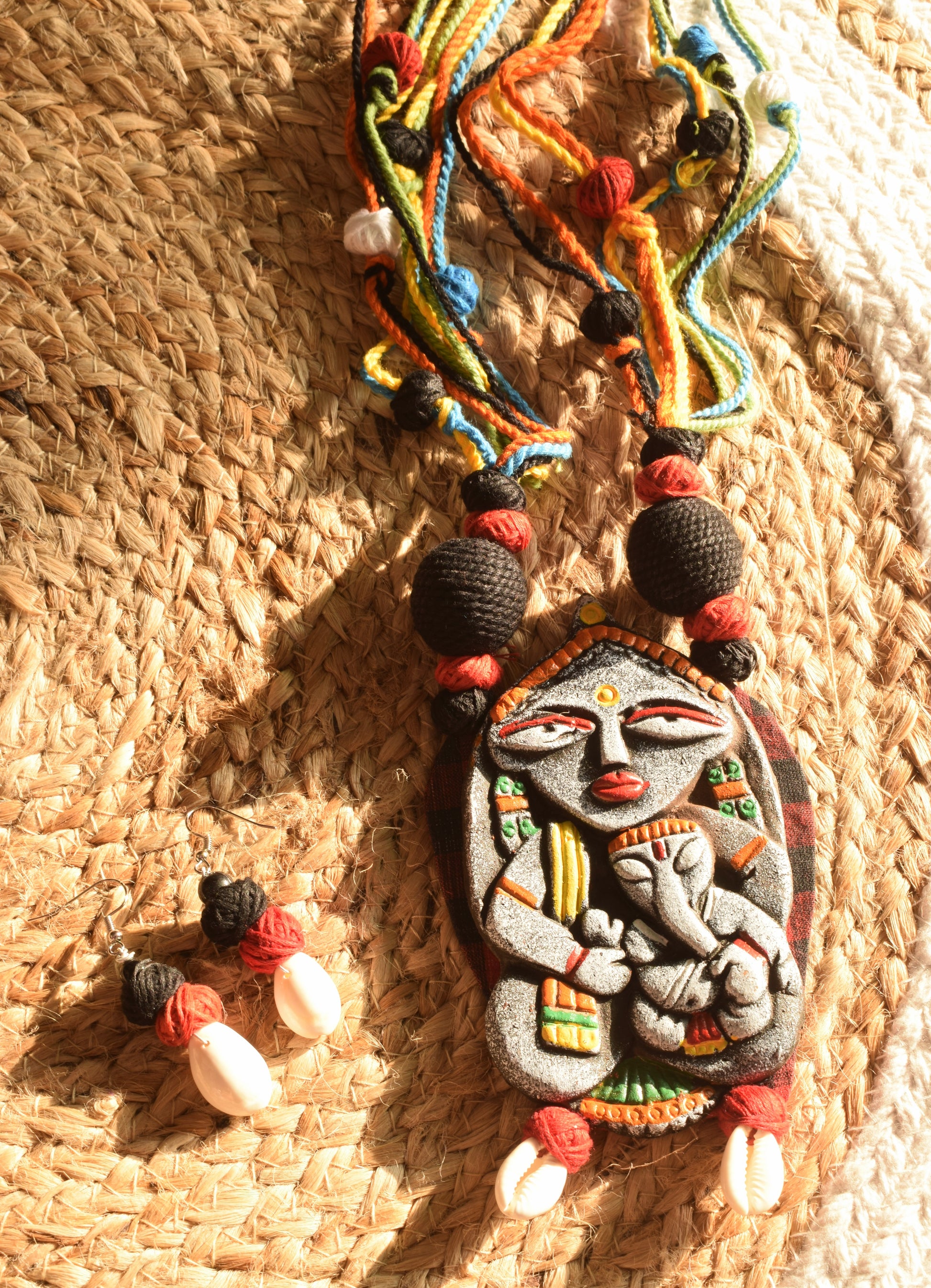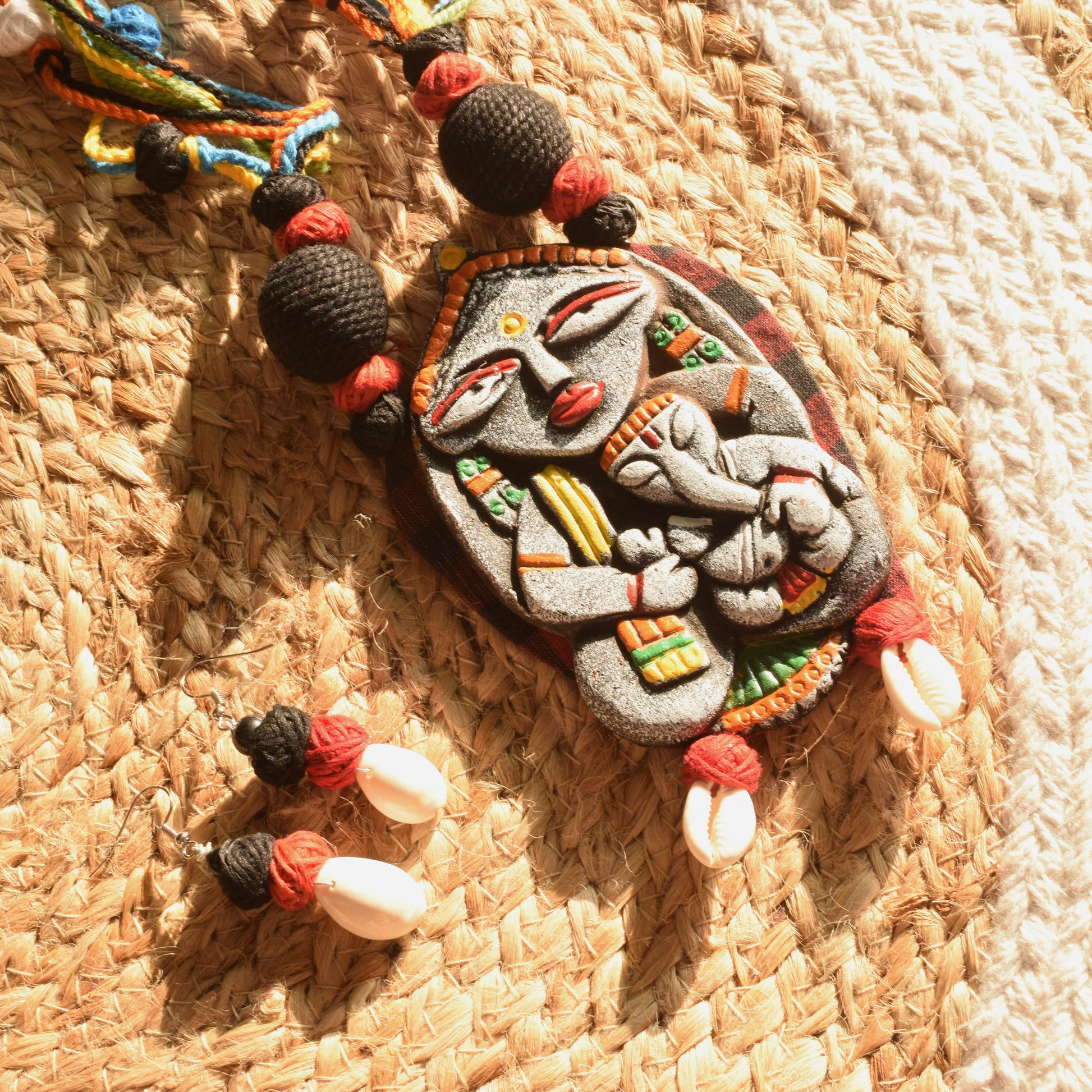 Terracotta Gauri Putra Ganesh Pendant Jute Necklace with Sea Shell Earrings